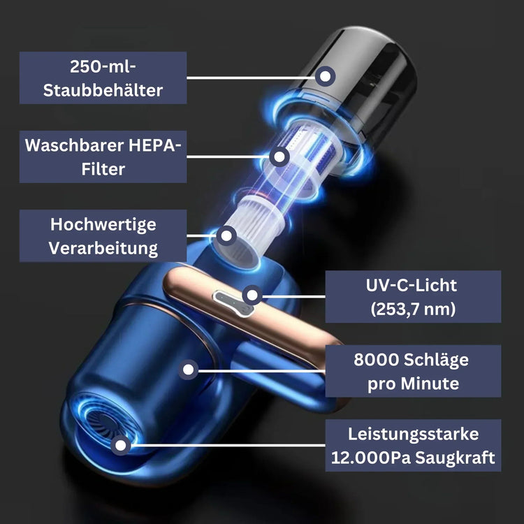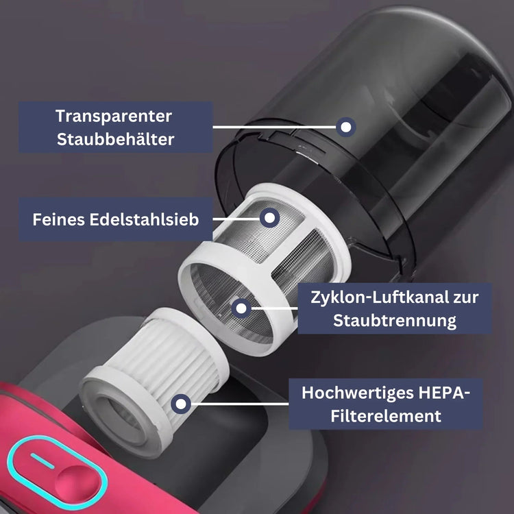 Das integrierte UV-C Licht tötet Milben, Bakterien und Keime ab. In Sekunden werden die Oberflächen desinfiziert. Wissenschaftlich bewährt gegen mikroskopische Schädlinge.