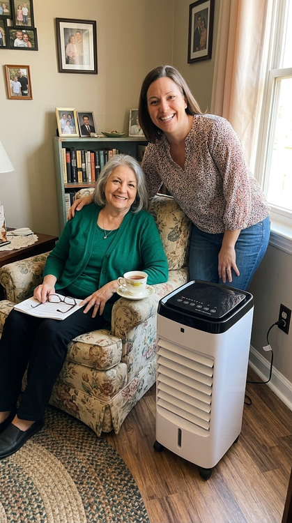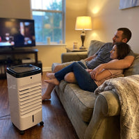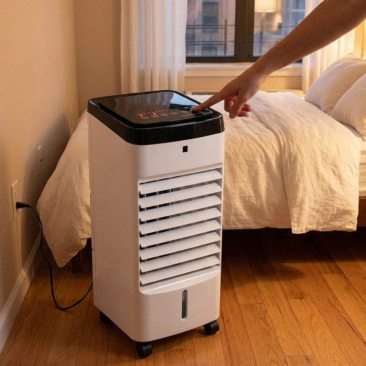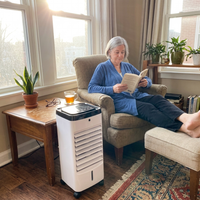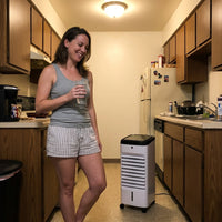 My mother is 76 and lives alone. She needed something she could manage completely independently. At 9 lbs she carries it between her bedroom and living room without asking for help. The removable tank means she fills it at the kitchen sink — she removes it, fills it like a pitcher, and puts it back. She doesn't need to move the unit or pour awkwardly. The 6 labeled buttons on the glossy black top — ON/OFF, SPEED, TIMER, MODE, COOL, SWING — are large enough to read without glasses. The remote lets her adjust it from her armchair. She called me after the first night. She said she'd slept better than she had in three years. At 9 lbs and with a removable tank, this is the right unit for elderly users living alone.