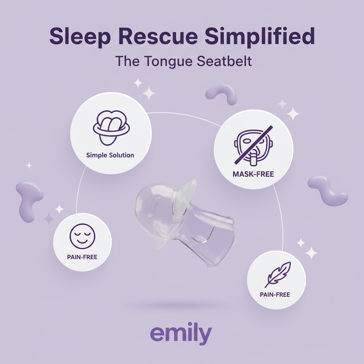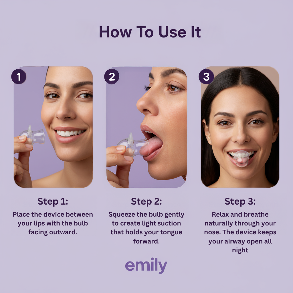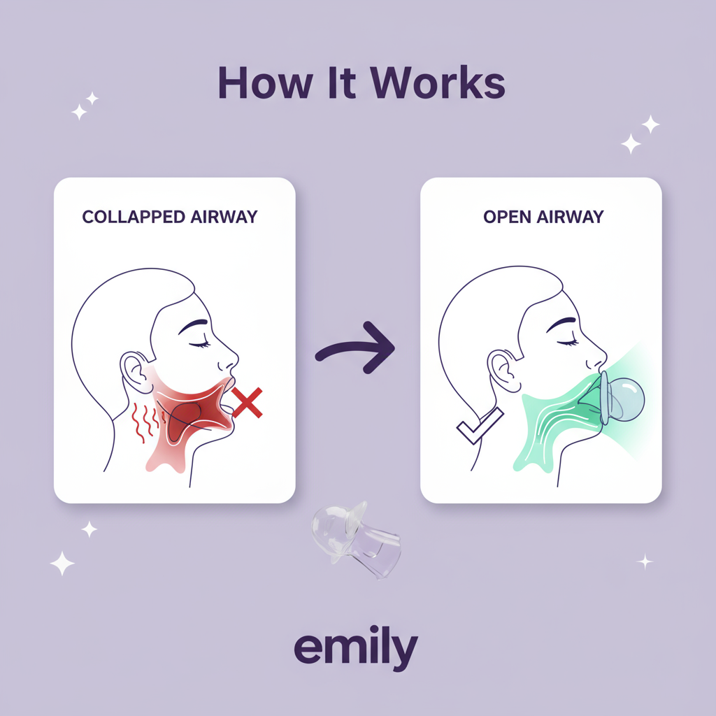 Think of it as a seatbelt for your tongue. While you sleep, your tongue naturally relaxes backward. Emilys Sleep gently holds it forward using soft micro-suction—helping maintain open, comfortable breathing all night.
