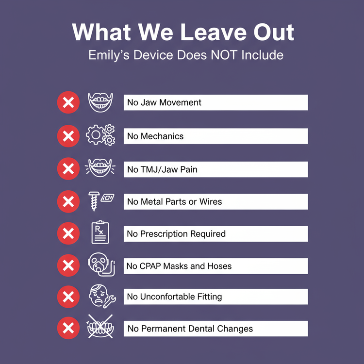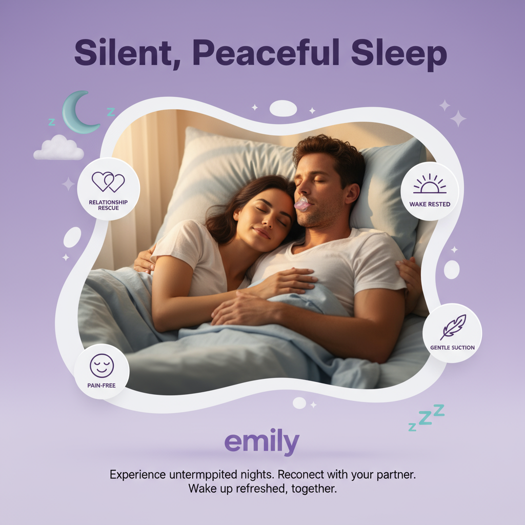 No CPAP mask. No jaw-cracking mouthguards. No painful pressure on your teeth. Emily's Sleep is the comfortable, non-invasive solution that finally lets you (and your partner) reclaim peaceful sleep.