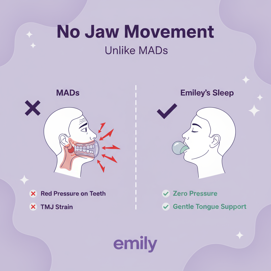 Unlike jaw-advancement devices (MADs), Emily's Sleep does NOT move your jaw forward. MADs can cause TMJ discomfort, tooth movement, and long-term dental issues. Emily's Sleep uses gentle suction to support only your tongue—zero pressure on teeth or jaw, and no risk of permanent changes.