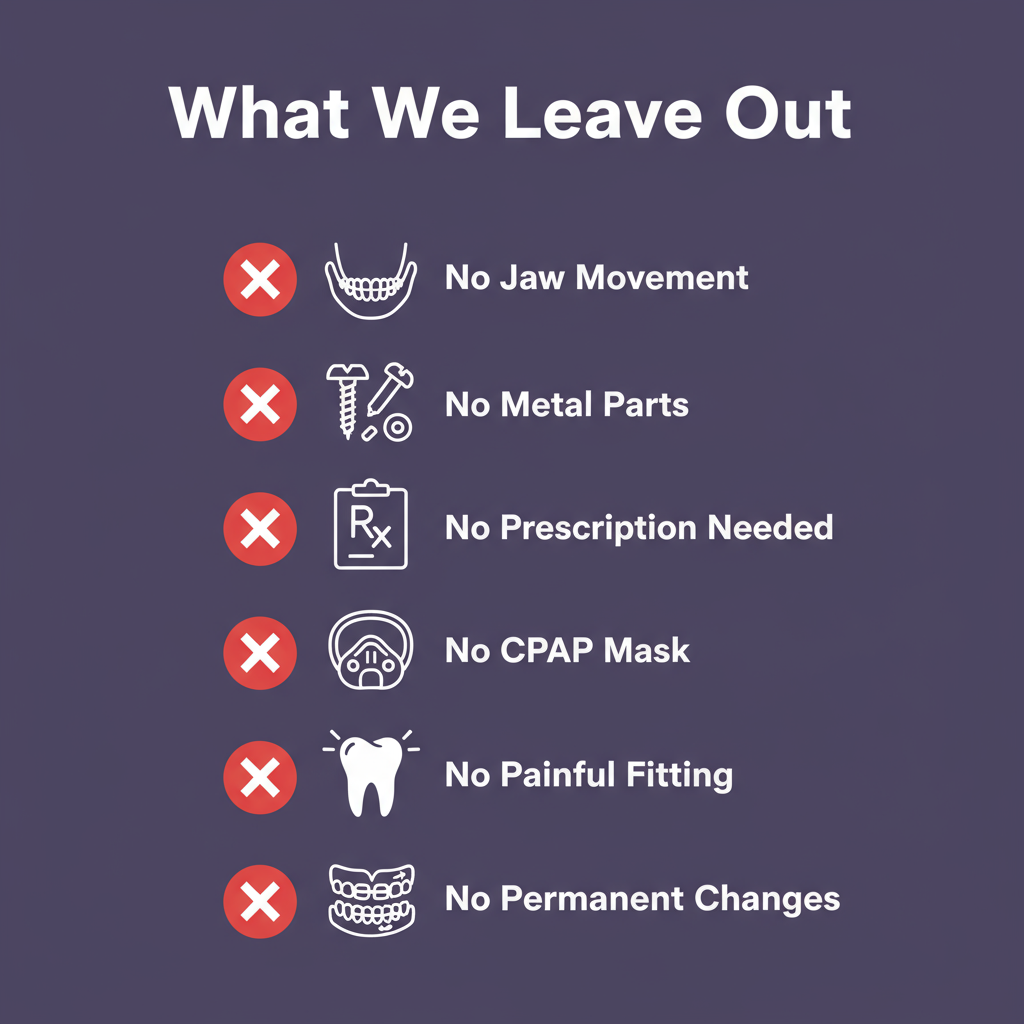- ❌ Jaw-moving mechanisms (no TMJ discomfort)
