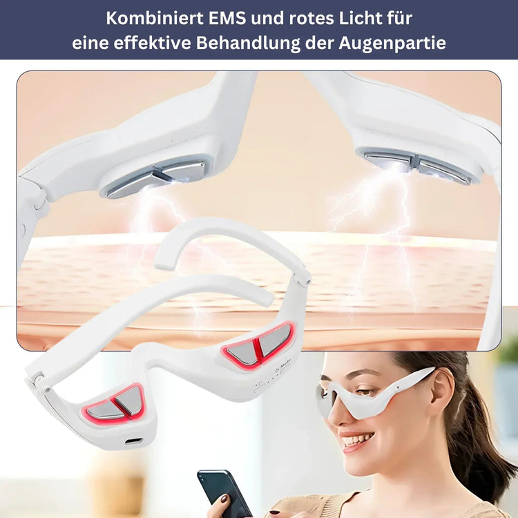 EMS (Elektrische Muskelstimulation) sendet sanfte Impulse in die Haut. Die Mikrostromtechnik regt die Durchblutung an. Kollagen- und Elastinproduktion werden aktiviert. Die Haut um die Augen wirkt straffer.