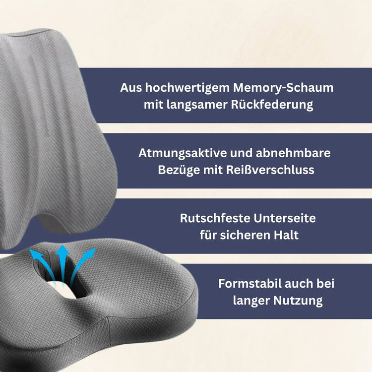 Das komplette Set für ergonomisches Sitzen. Rückenpolster und Sitzkissen perfekt aufeinander abgestimmt. Verbessern Sie Ihre Sitzhaltung am Arbeitsplatz oder Zuhause.