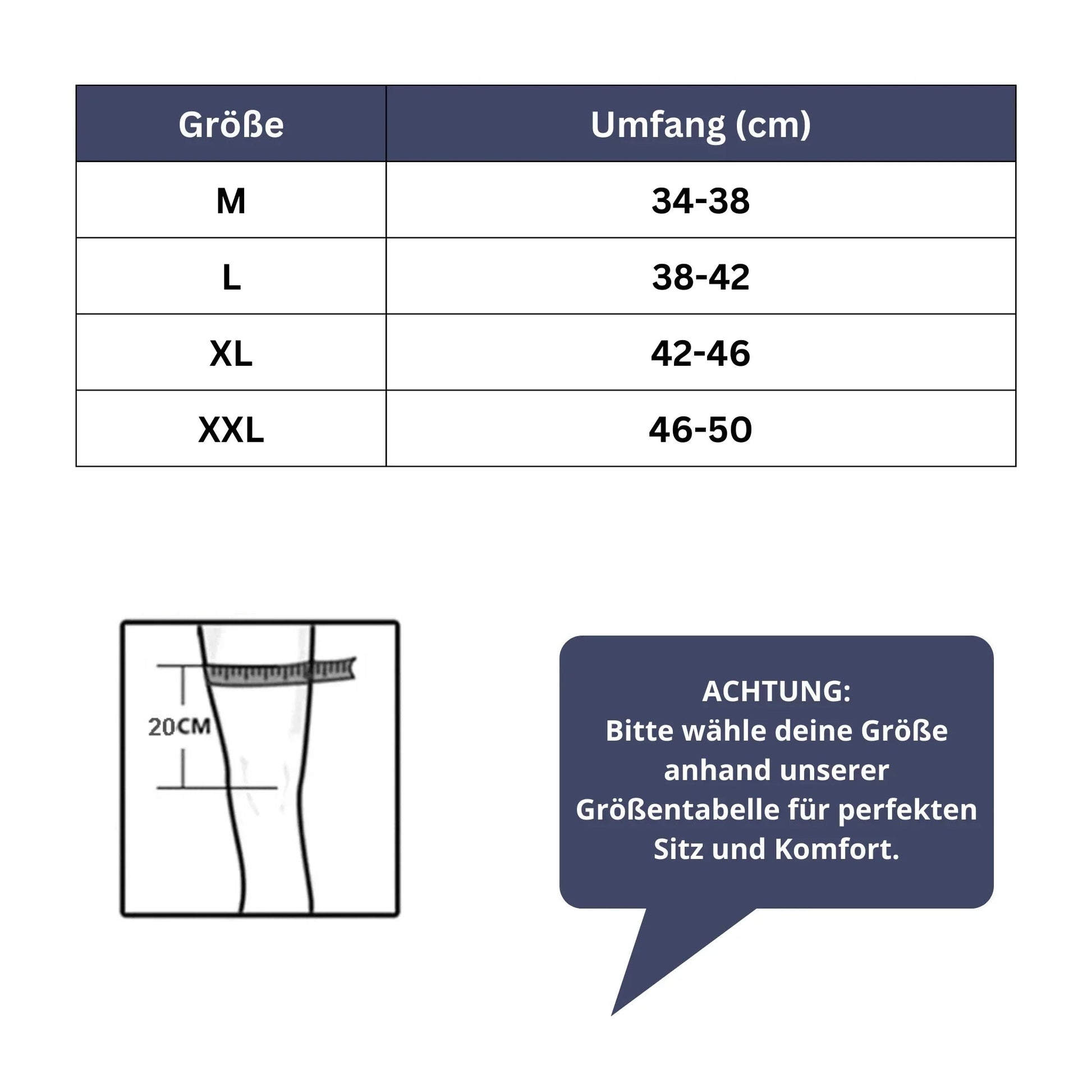 Messen Sie den Umfang Ihres Knies in der Mitte der Kniescheibe. Vergleichen Sie mit der Größentabelle. Bei Zwischengrößen empfehlen wir die größere Größe für mehr Komfort.
