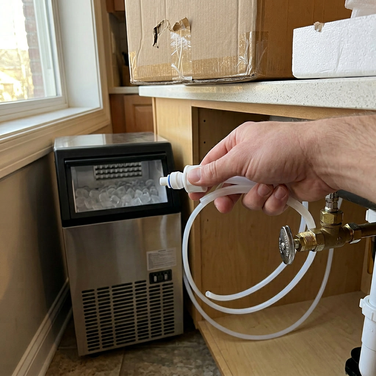 The 120-inch water inlet line connects directly to any standard faucet with the included quick connector — no plumber, no permanent modification, no tools beyond what's in your drawer. The 80-inch drain line handles itself. Most customers are making ice within an hour of opening the box. From that moment on, the machine runs itself. You just open the lid and take what you need.