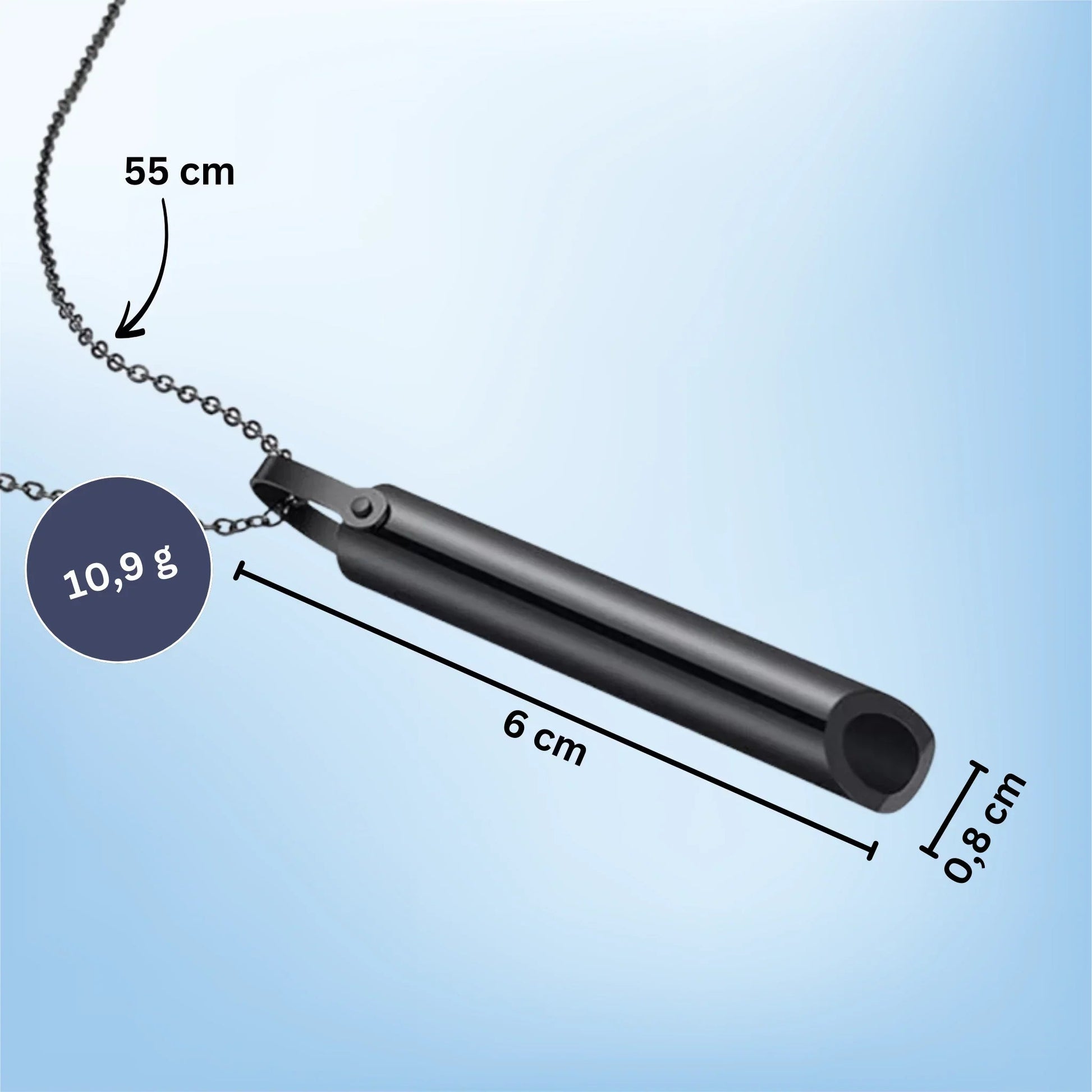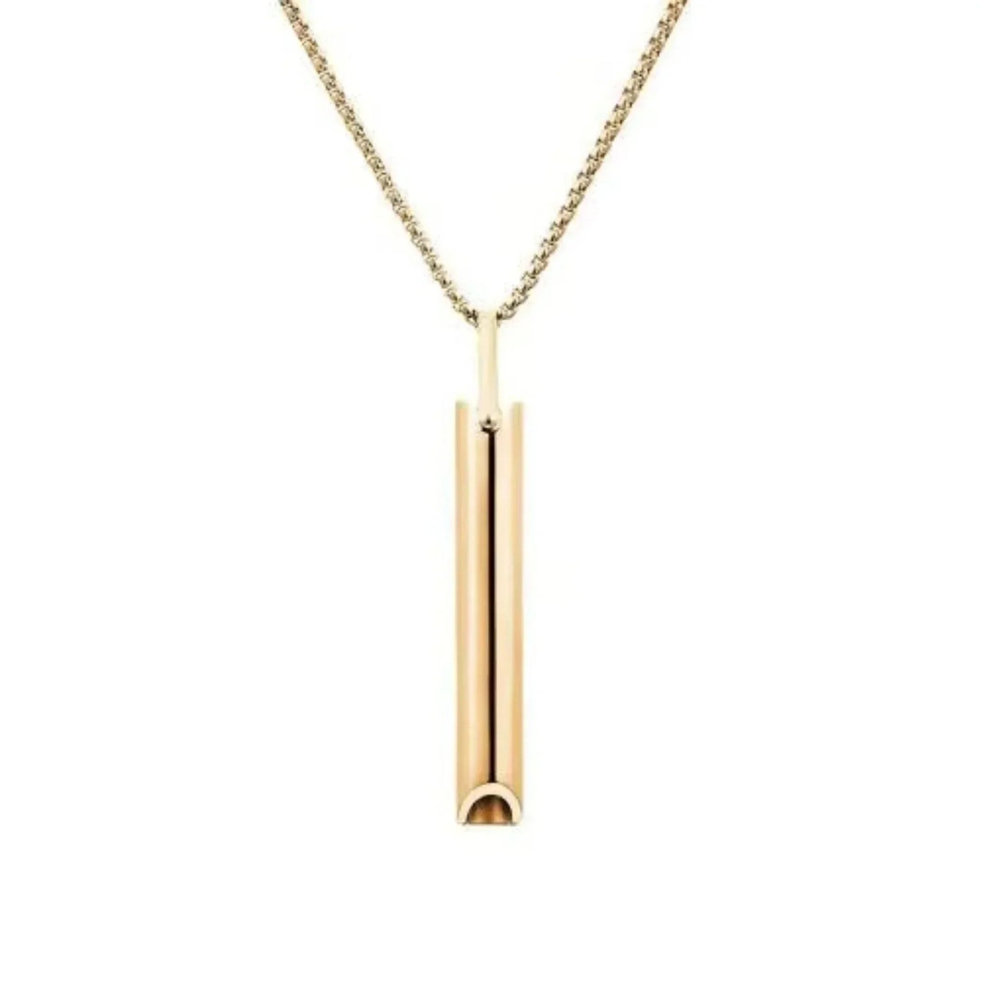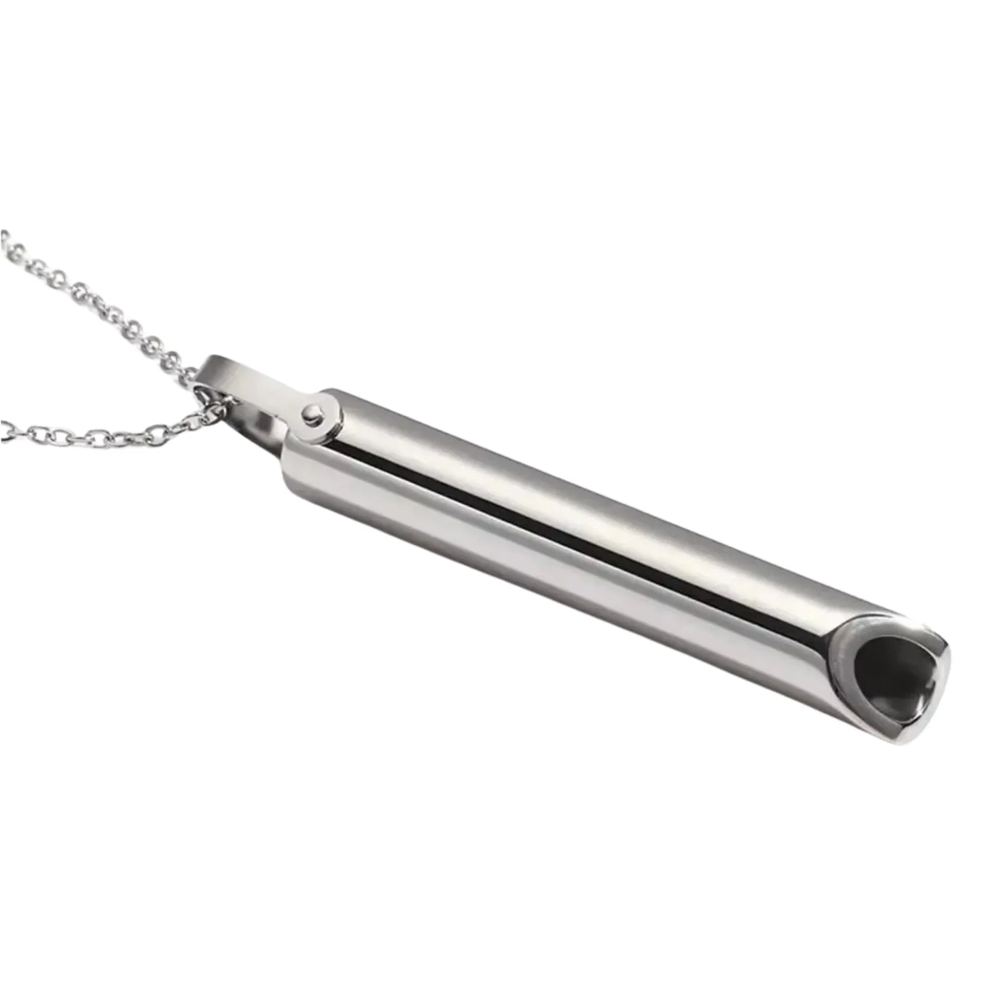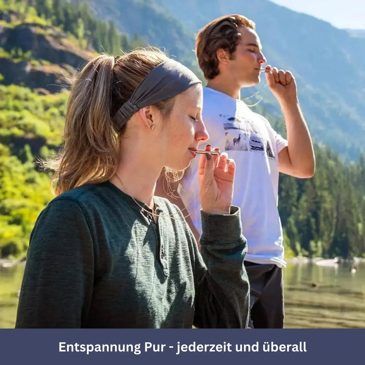 Du atmest durch die Pfeife aus, die einen sanften Widerstand erzeugt. Das verlangsamt die Ausatmung und aktiviert den Vagusnerv. Dieser signalisiert dem Körper: Entspannung. Keine Technik zu lernen - einfach ausatmen.